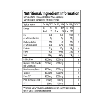 L-Citrulline, Taurine, Glycersize, Betaine, Peak 02®, S7®, Himalayan Pink Salt, flavouring, Colouring, Anti Caking Agent (Silicon Dioxide), Sweetener (Sucralose)